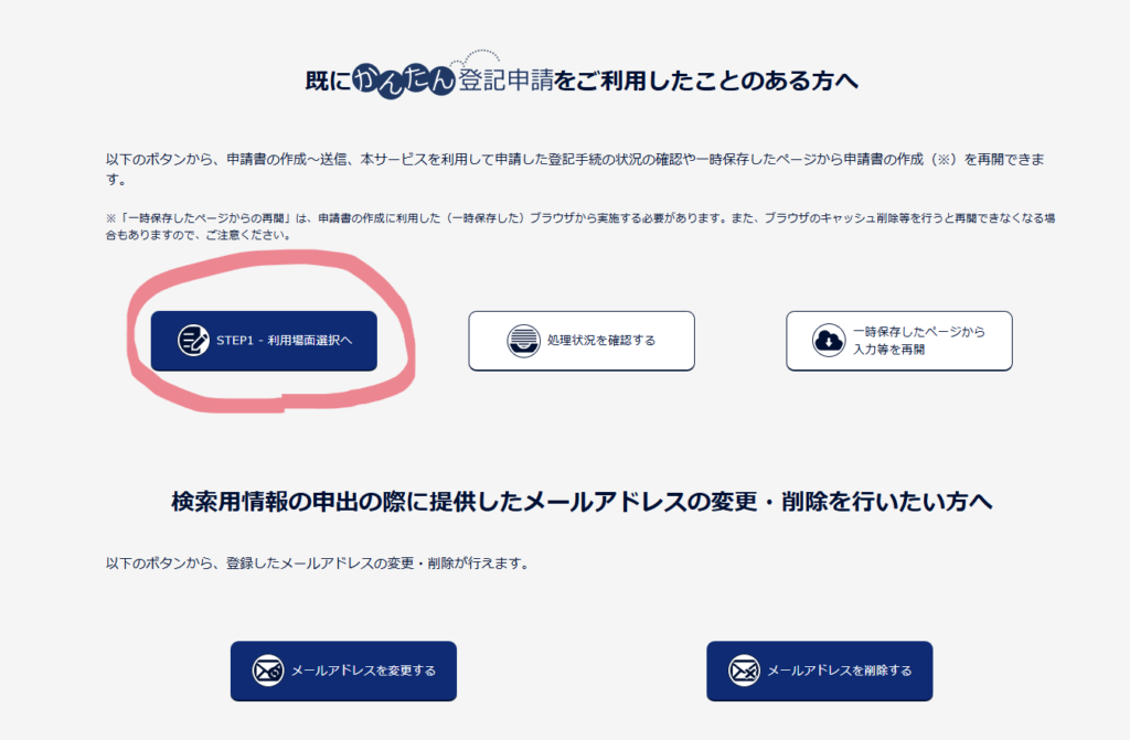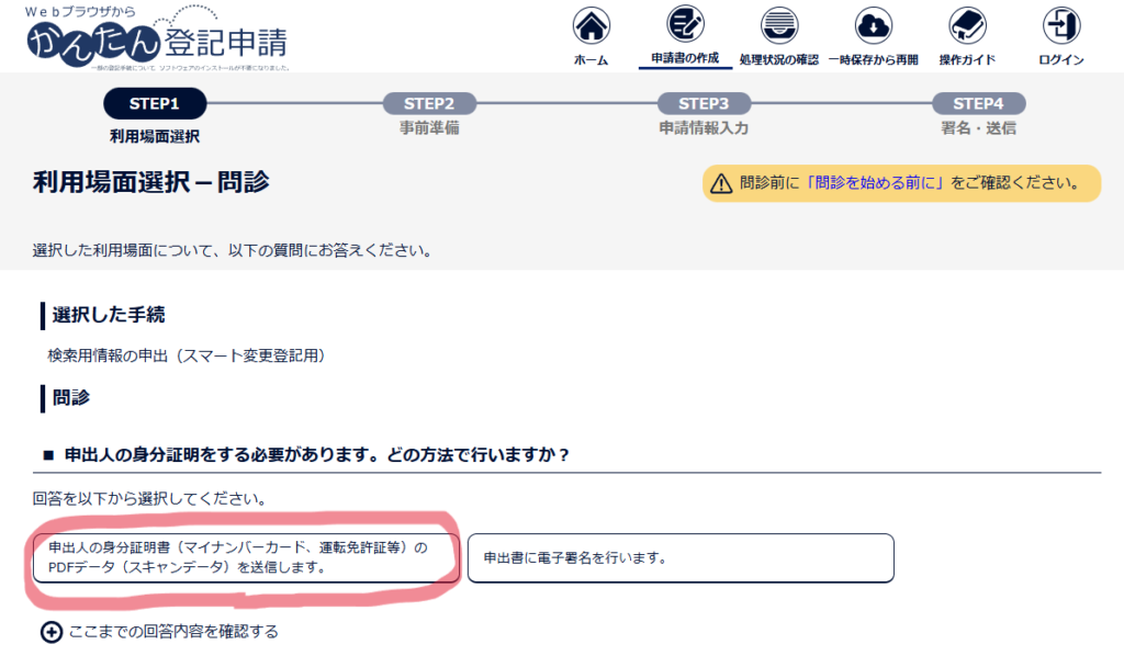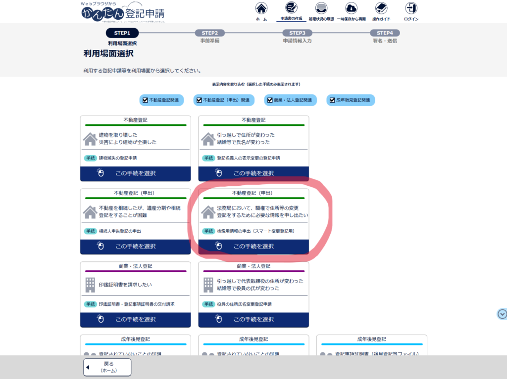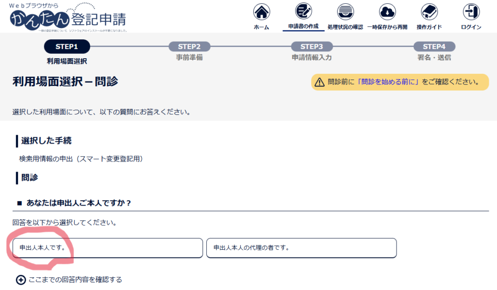 2. STEP1の「利用場面選択」→「不動産登記(申出)」を選択→「問診2つ答える