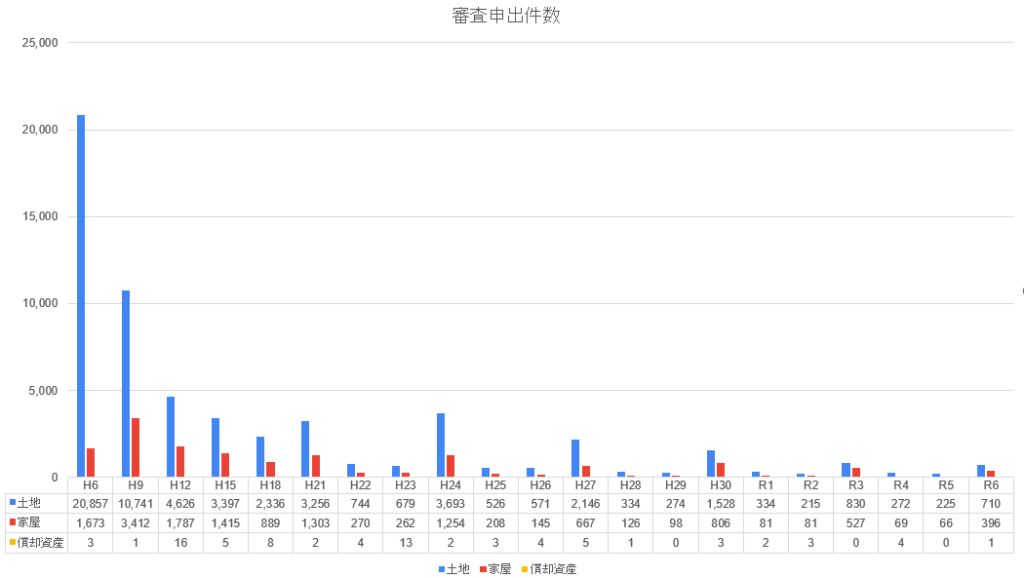 しかしながら、固定資産評価委員会への審査申出に関する統計データを見ると、この審査申出件数は長期的に減少傾向にあります。