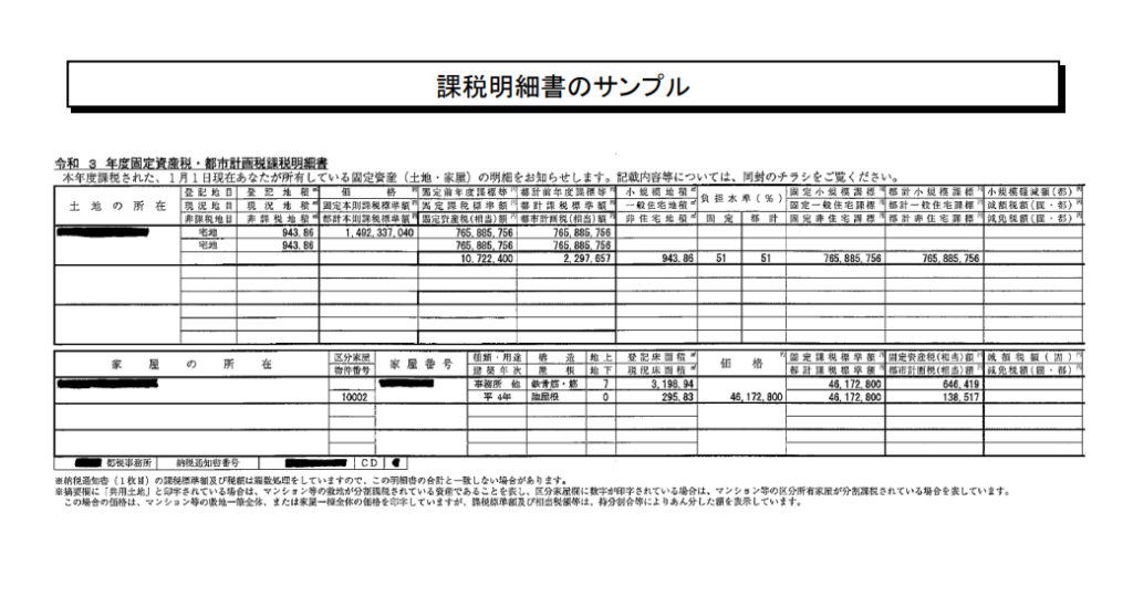 課税明細書・・・毎年4月~6月頃に、市区町村から郵送される固定資産税の納税通知書に添付されている書類