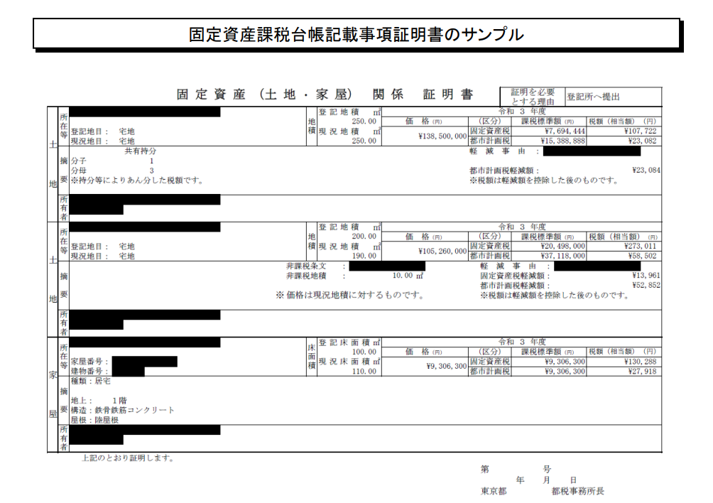固定資産評価証明書・・・固定資産の評価額や面積、地目、名義人などを証明する公的な書類